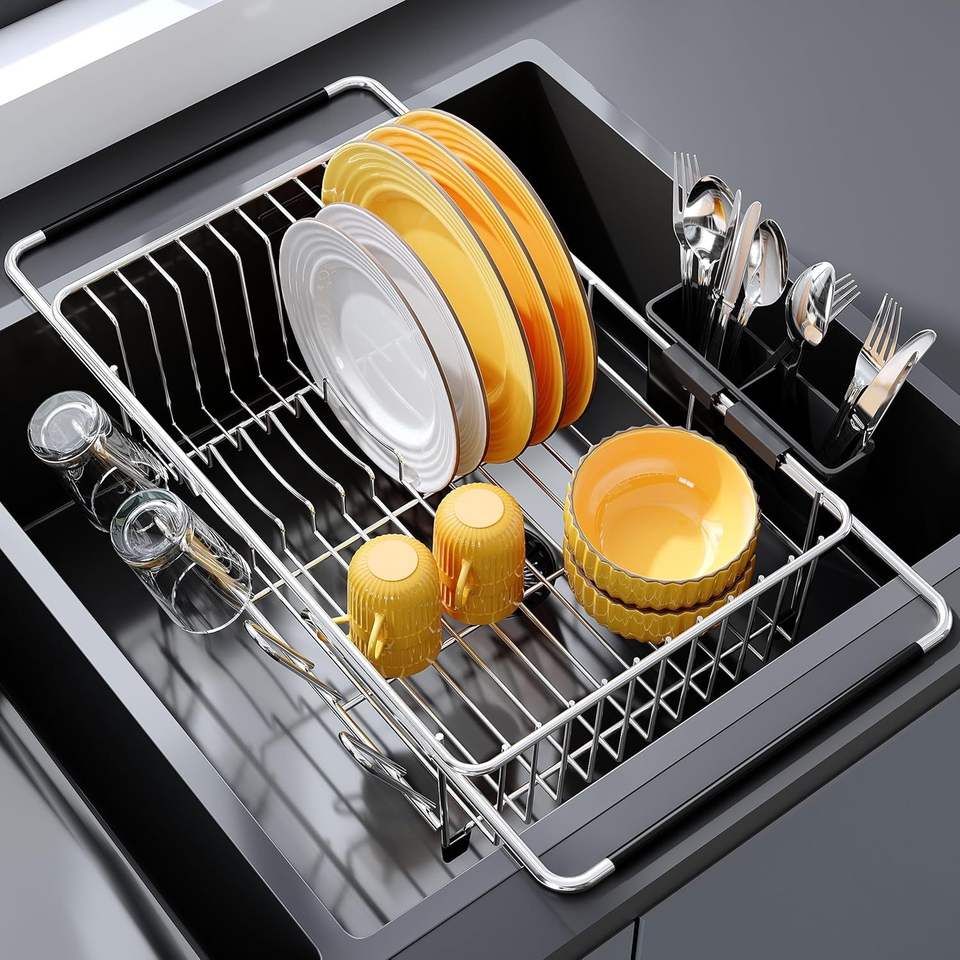 Égouttoir à vaisselle extensible en acier inoxydable pour petite cuisine, à poser au-dessus de l'évier, design moderne et compact pour gagner de la place sur le comptoir