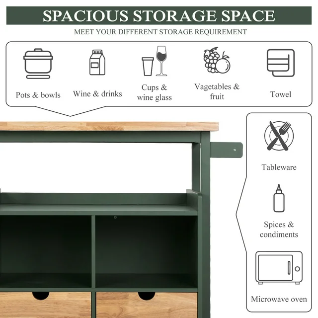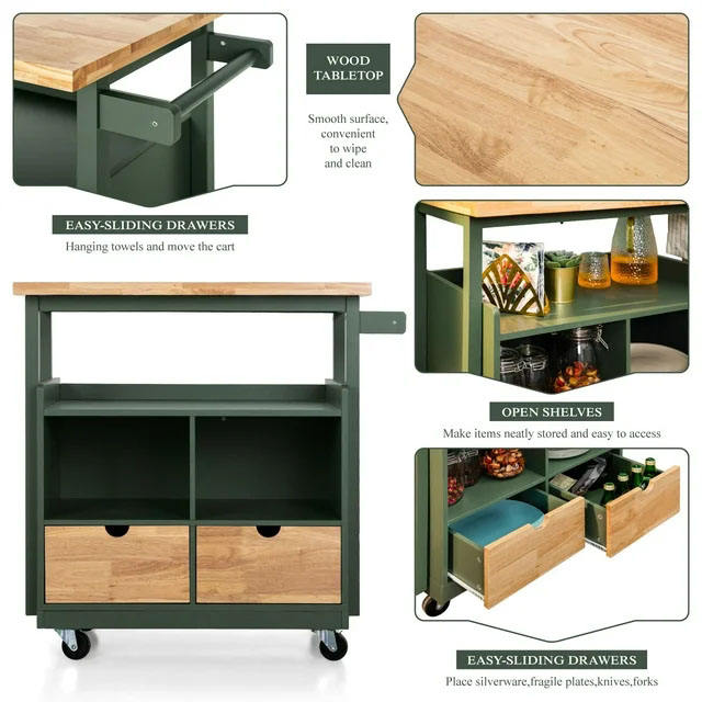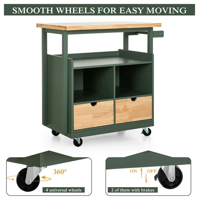 Small Kitchen Trolleys Wooden Kitchen Island Cart on Wheels with Storage Drawer and Cabinet - Green