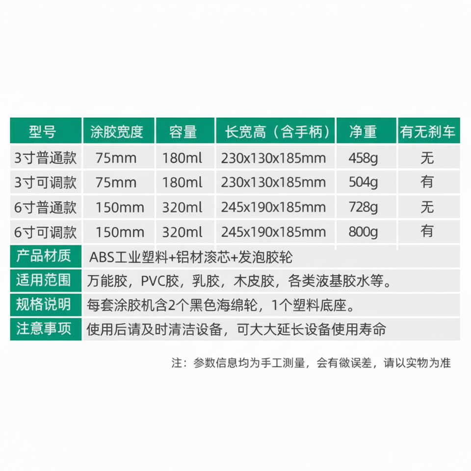 Specifications and Models: Green; 6-inch glue applicator (adjustable); sponge