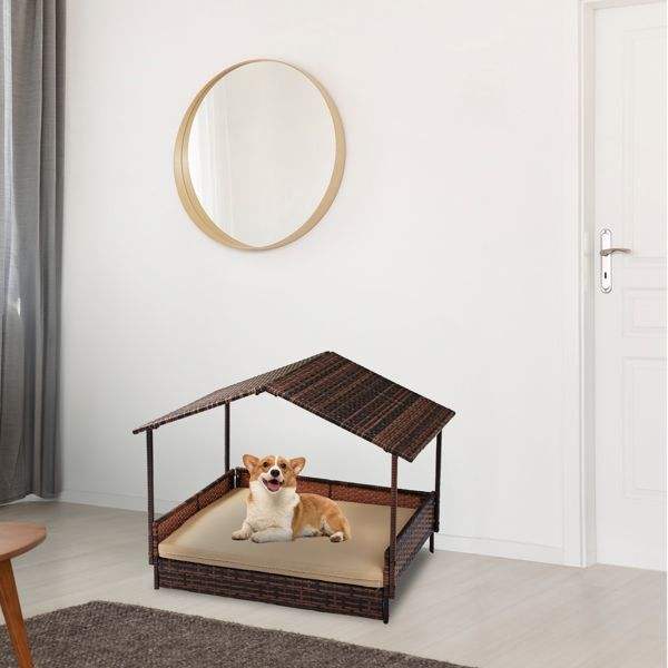 Small Medium Sized Elevated Rattan Dog House Washable Cushion Cover Indoor Outdoor Raised Pet Furniture Wicker Dog Bed Canopy