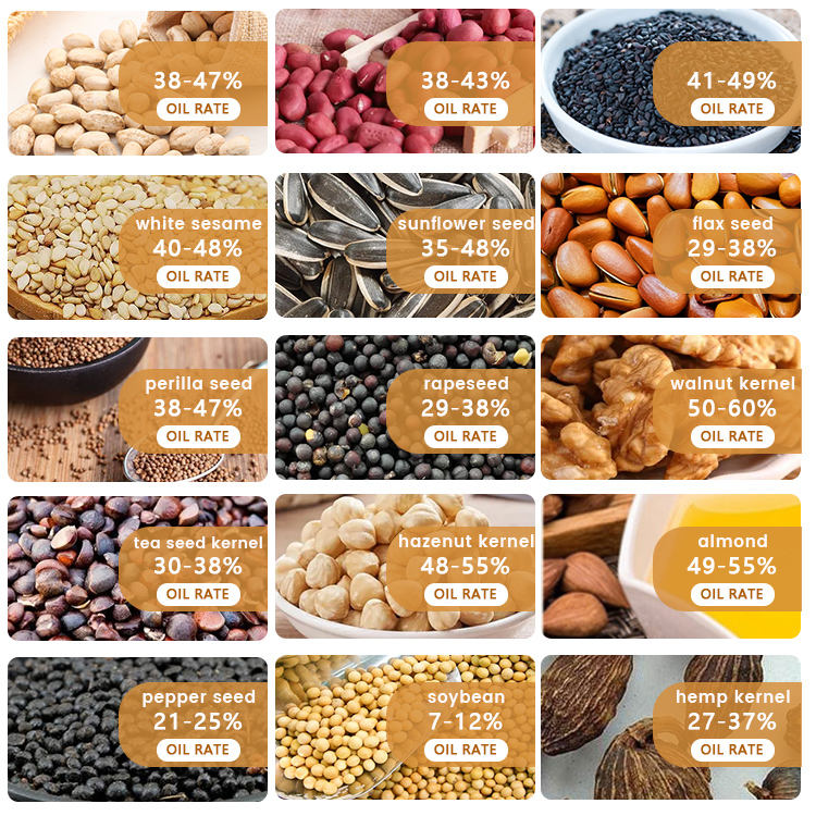 huile de graine d'asphalte, Huile de soja, Rap d'huile de graine, Huile de graines de thé, Huile de basilic, Huile de sésame, D'huile de noix de pin, Huile de graines de tournesol, Almond oil, Huile de noix, Huile d'arachide, Huile de noix de coco, Huile d'olive, Huile de palmeType d'huile