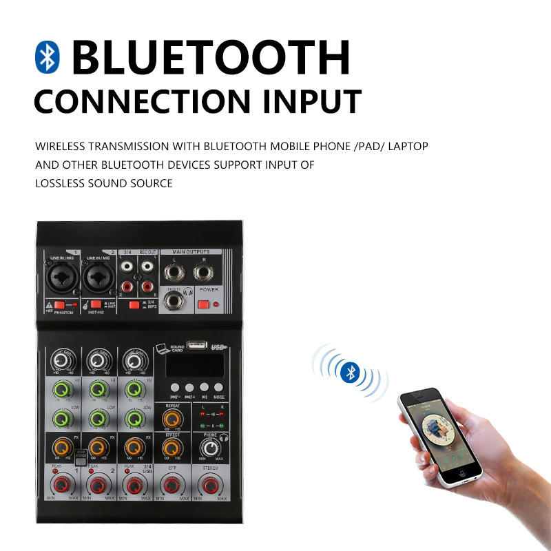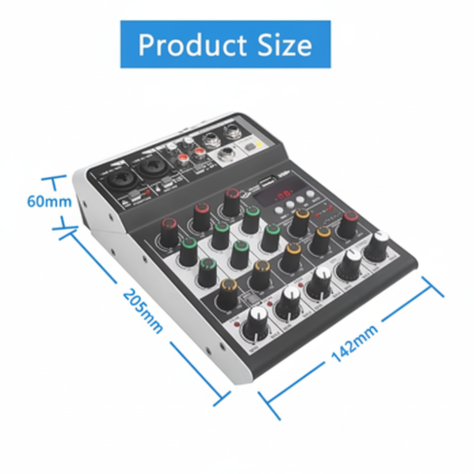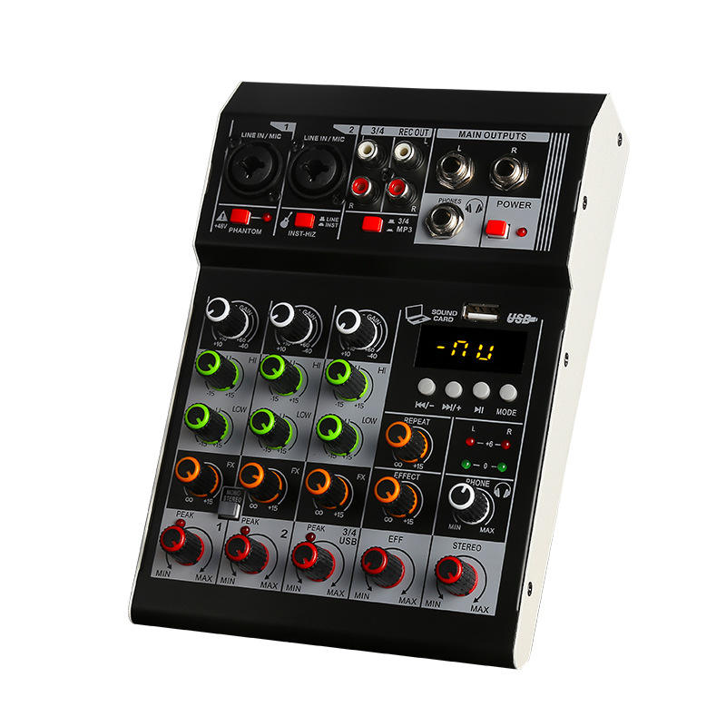 Mini-mixeur audio populaire 4 canaux avec suppression du bruit, interface USB/BT et effets pour la production musicale et les performances en direct