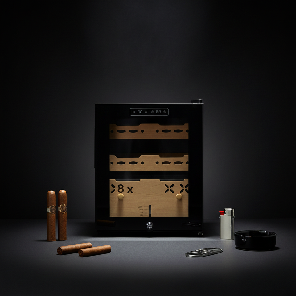 Armoire à cigares compacte grande capacité en cèdre espagnol et acier inoxydable, refroidissement par compresseur monozone, éclairage LED, électronique