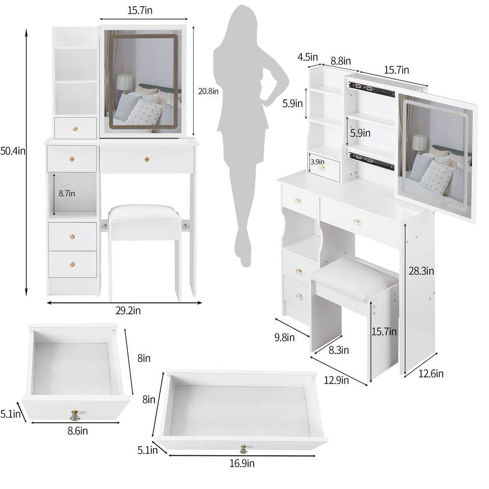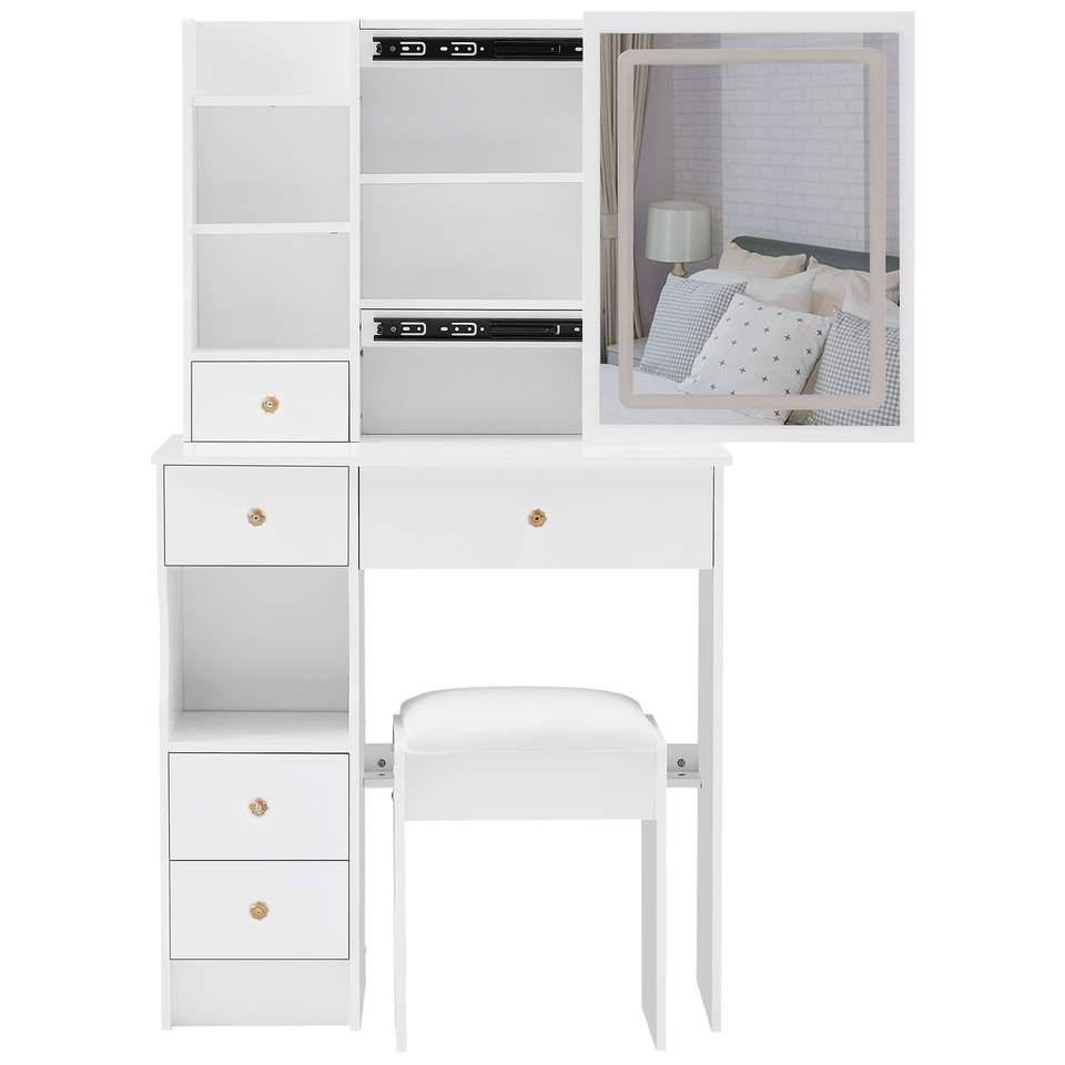 Petite table de maquillage de bureau avec tiroir gauche, tabouret rembourré, miroir LED coulissant à commande tactile, commutation tricolore