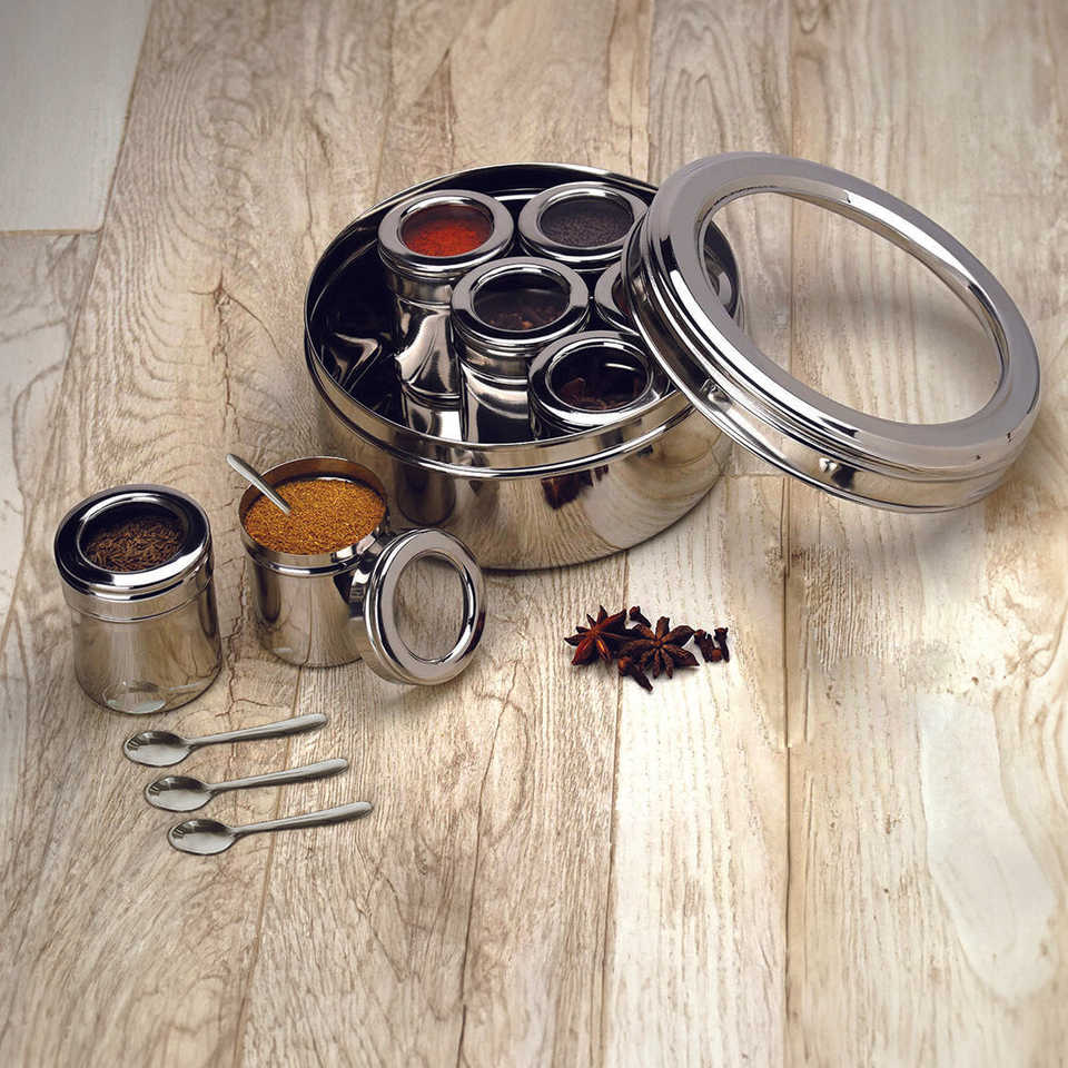 Petite boîte Masala en acier inoxydable avec couvercle transparent 7 contenants comprenant une cuillère pour une organisation facile à voir Boîtes de rangement et bacs