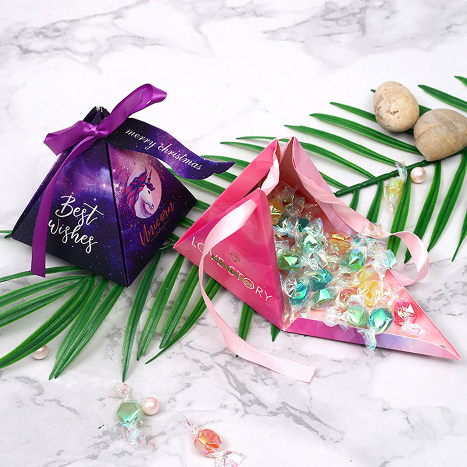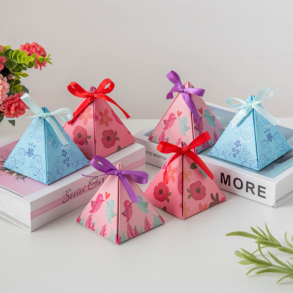 Petite boîte cadeau en forme de pyramide triangulaire pour bonbons et chocolats avec ruban pour les invités de mariage