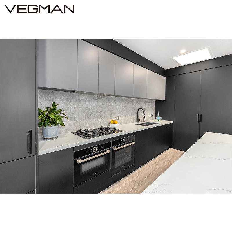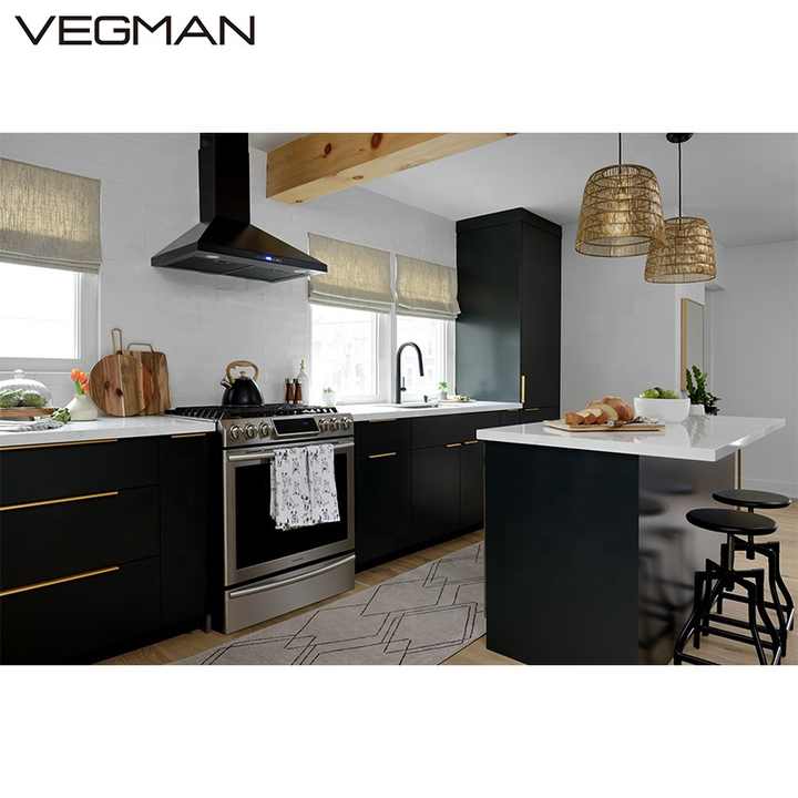 Petite armoire de cuisine haute en contreplaqué de bois noire avec îlot
