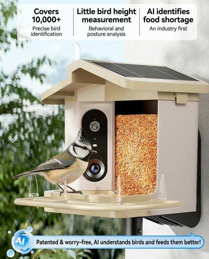 Mangeoire à oiseaux intelligente avec caméra – Alimentation solaire, contrôle par application, identification des oiseaux et alerte de niveau de nourriture