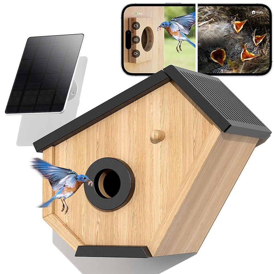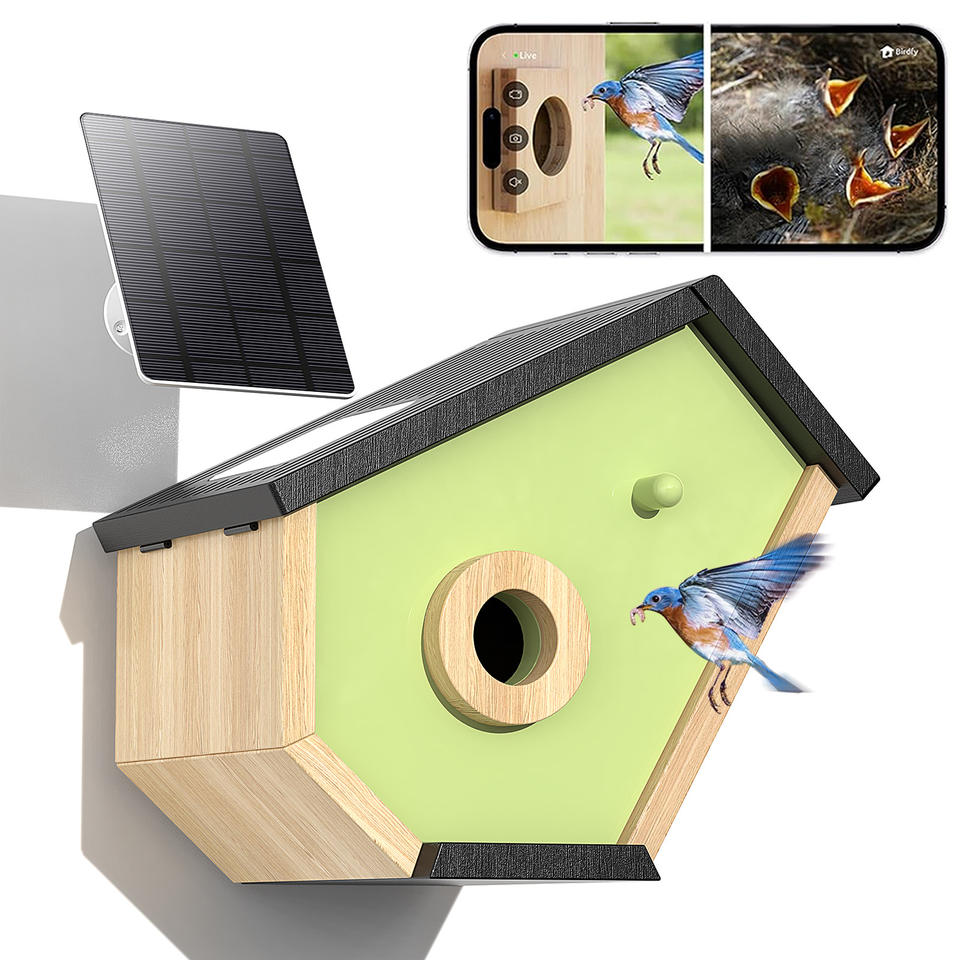 Nichoir intelligent avec caméra, alimenté par énergie solaire, vidéo en direct 1080HD, vision nocturne, enregistrement de nidification 24h/24, détection automatique et notification