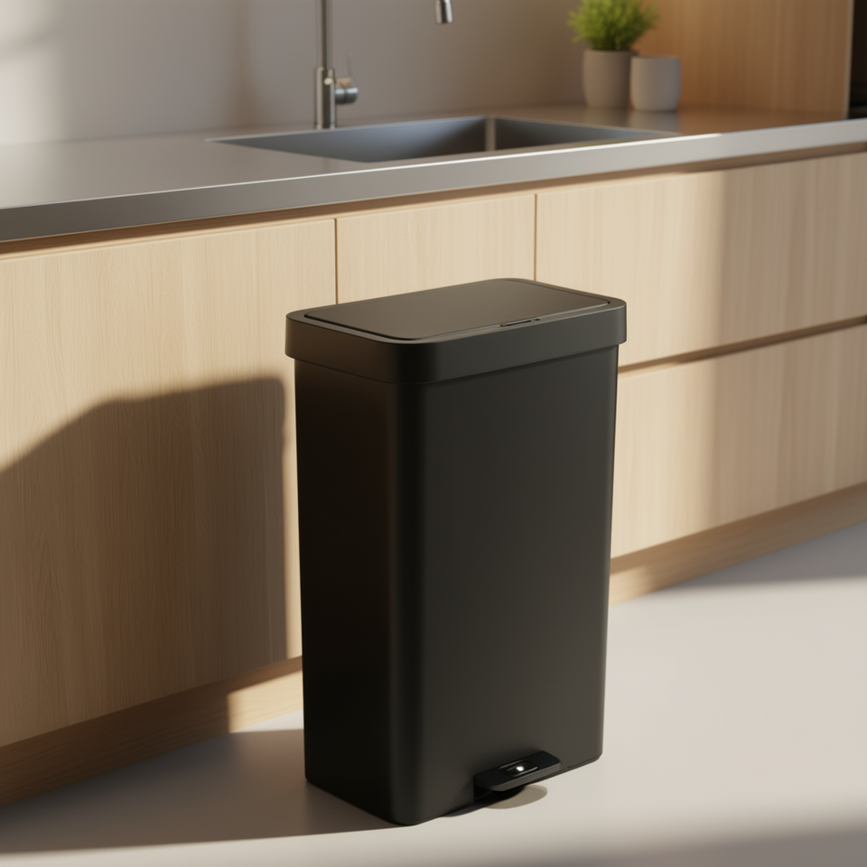 Poubelle de cuisine intelligente noire en plastique avec capteur de mouvement automatique et couvercle, style moderne rectangulaire sur pied