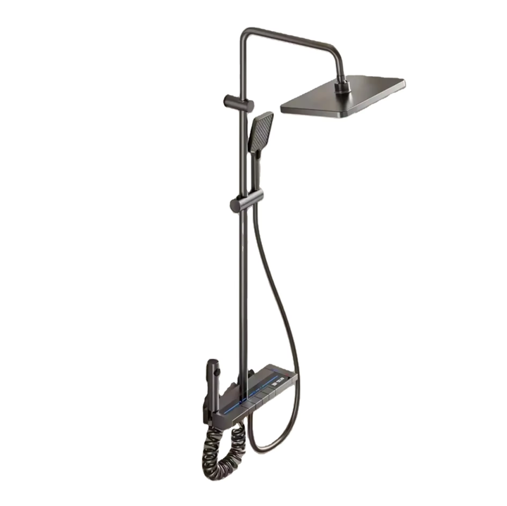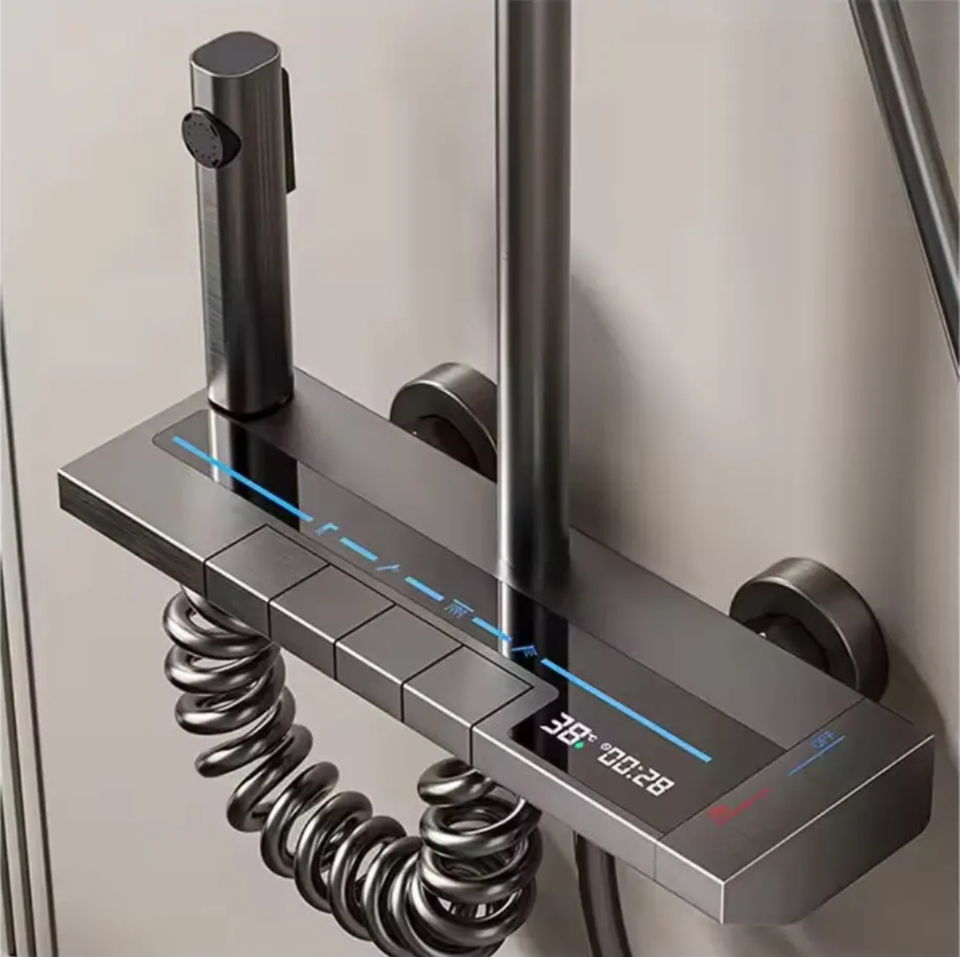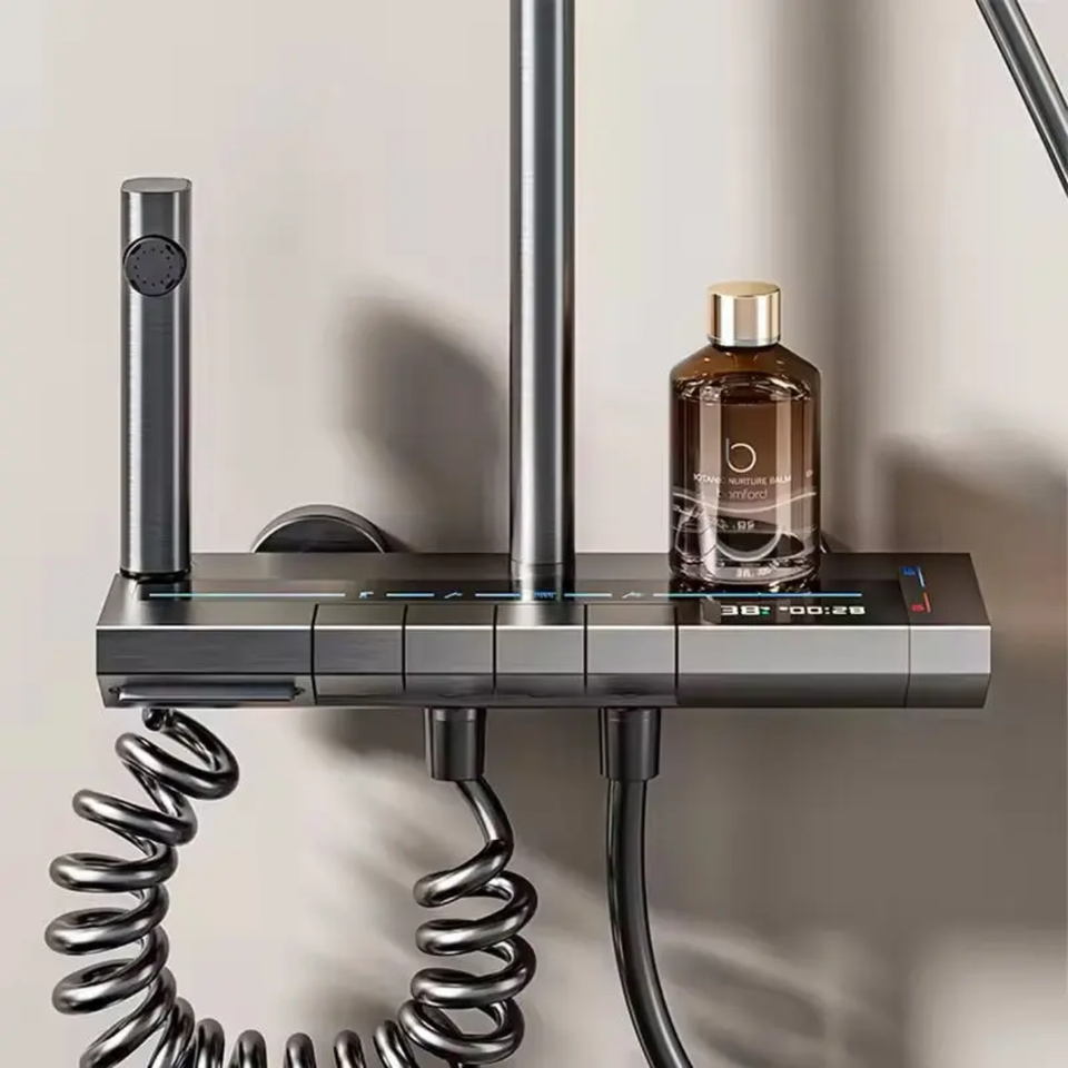Ensemble de douche thermostatique intelligent à affichage numérique, commande par touches piano, système de pluie gris anthracite avec douchette et pulvérisateur bidet