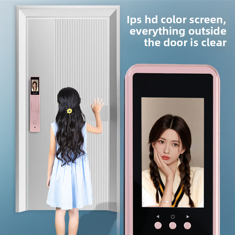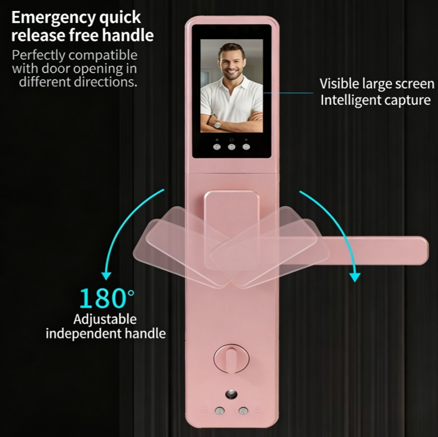 Serrure de porte intelligente avec caméra œil de chat 4,5 pouces, déverrouillage à distance via application, reconnaissance faciale/empreintes digitales, processus de gravure de précision, finition anodisée moderne, Cloud