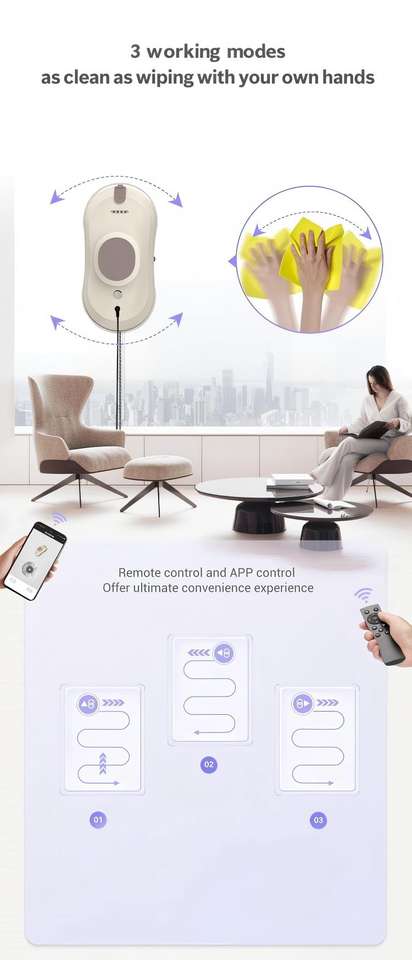 Robot de nettoyage de vitres électrique intelligent entièrement automatique, 3 modes, contrôle anti-chute, contrôle par application, navigation intelligente, sans traces