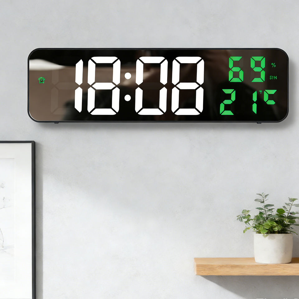 Horloge murale intelligente moderne en plastique avec affichage LED numérique, miroir, alarme, température et humidité, alimentation USB/piles, pour salon