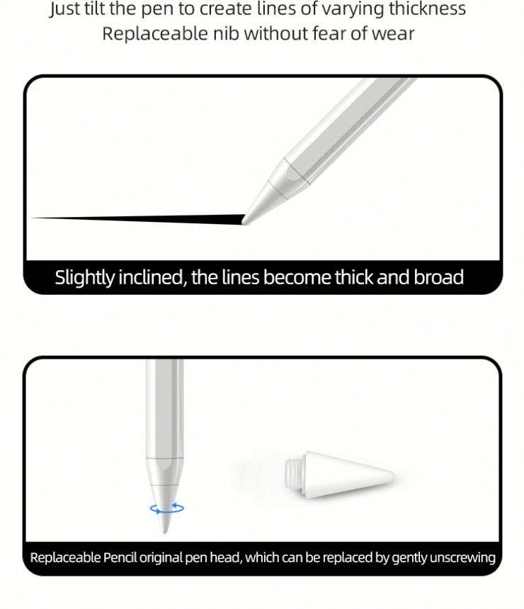 Technologie de détection active, Plume remplaçable, Rejet de la paume, Détection d'angle d'inclinaison
