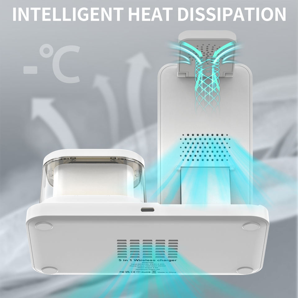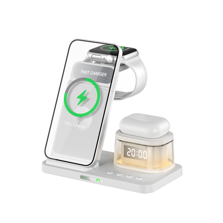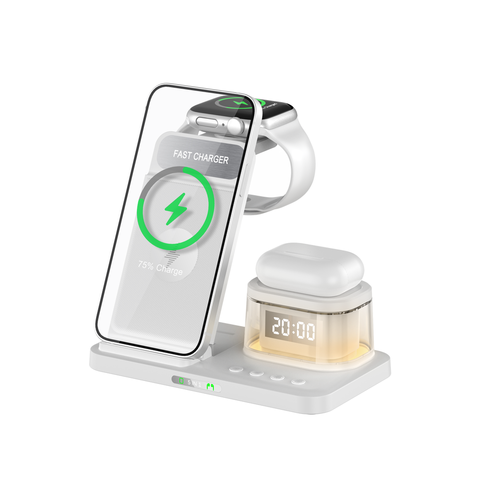 2024 Offre Spéciale produit lumière LED avec horloge de nuit alarme Qi pliable 5 en 1 chargeur sans fil pour Iphone Airpods Apple Watch