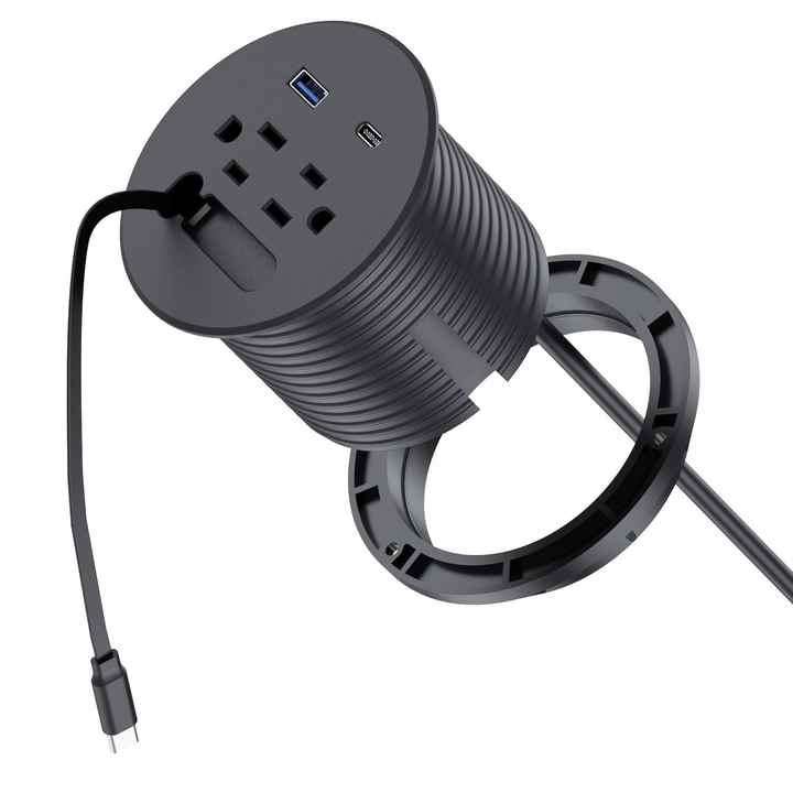 Prise de bureau intelligente américaine encastrée avec 1 câble USB-C rétractable, prise de bureau et de canapé encastrée, prise de bureau ronde