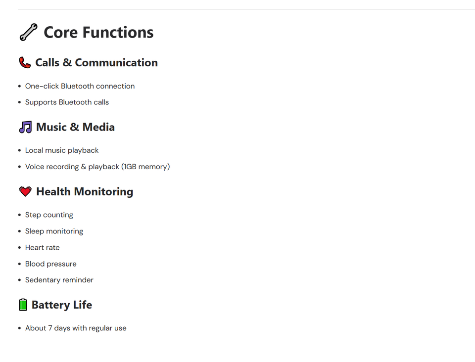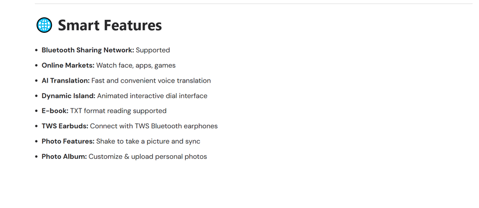 Fonctionnalité:Activité Tracker, Assistant vocal AI, Alarme horloge, Répondre à un appel, Calculatrices, Calendrier, Rappel de Téléphone, Traceur de calories, Boussole, Composez un numéro, Traqueur de Distance, Pisteur fitness, Contrôle des gestes, Navigation gps, Fréquence cardiaque Tracker, Interactive musique, Multiport Tracker, Lecteur de musique, Noctiluque, Paiement, Lancer essage, Télécommande, Rappel sédentaire, Sommeil, Les Médias sociaux Notifications