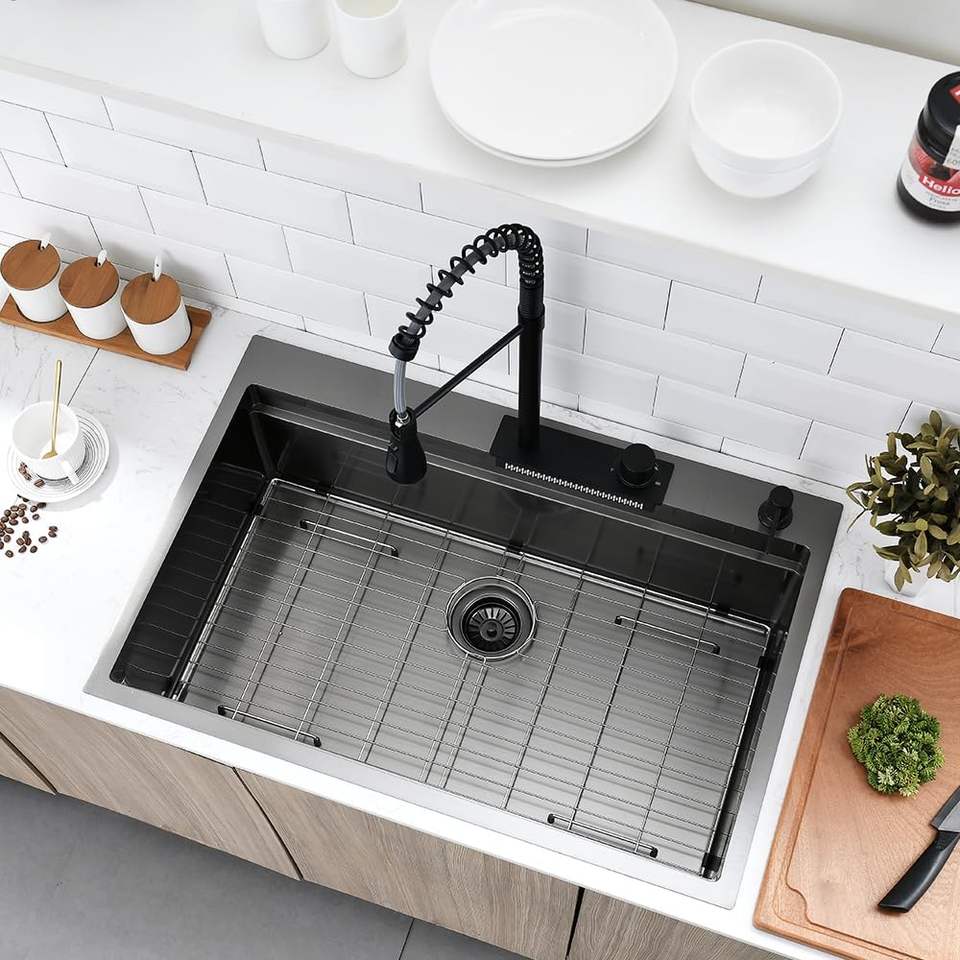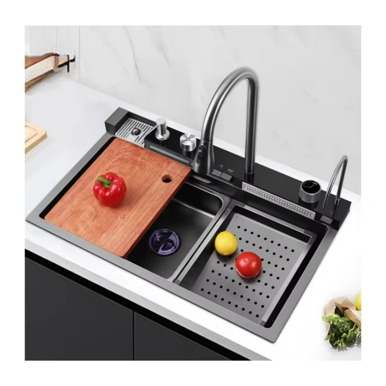 Robinet de cuisine noir cascade intelligent évier de cuisine en acier inoxydable poli