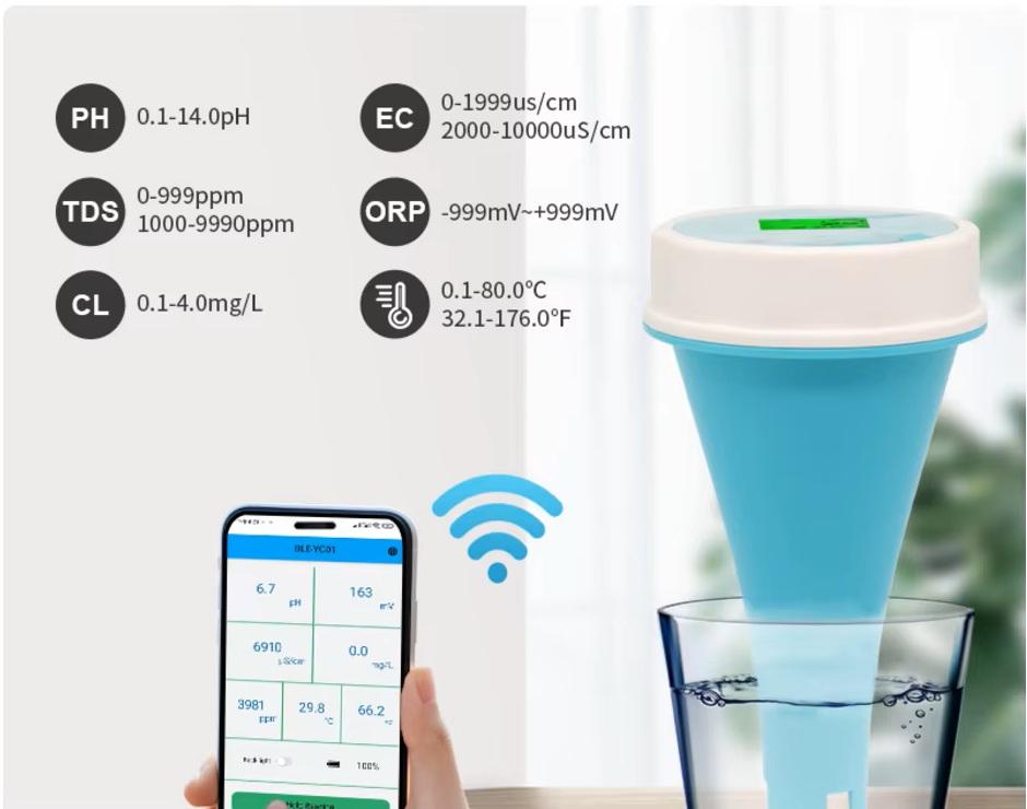 Analyseur de qualité de l'eau intelligent et étanche 6 en 1 pour piscine et aquarium PH/TDS/EC/ORP/chlore/température