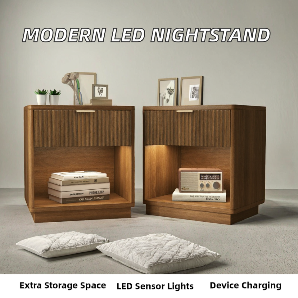 Table de chevet en bois intelligente avec lumière LED à capteur, port de charge USB, table de chevet cannelée, mobilier de chambre moderne