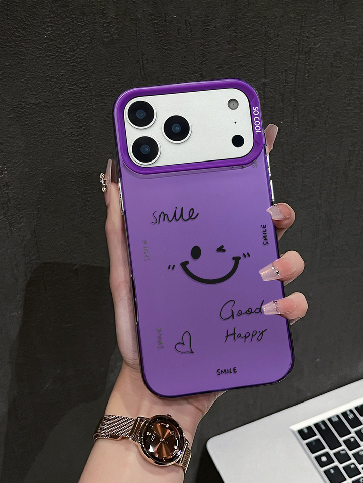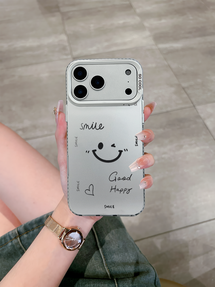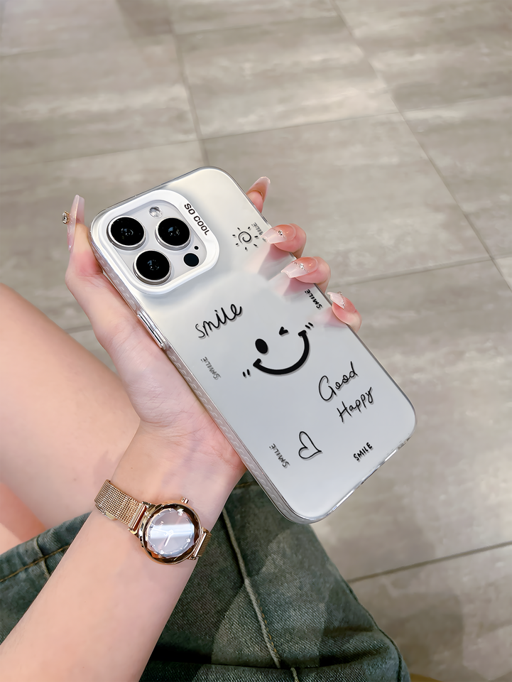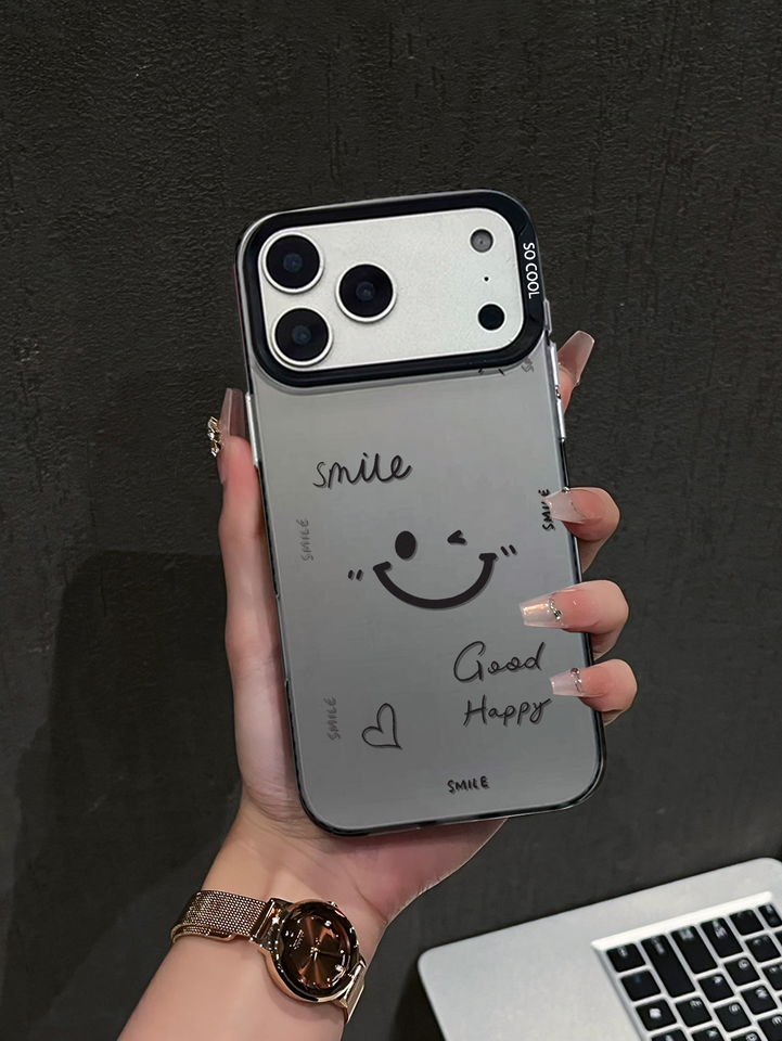 Coque intégrale antichoc en TPU avec motif visage souriant et citations positives, design gris argent mat, compatible avec la série