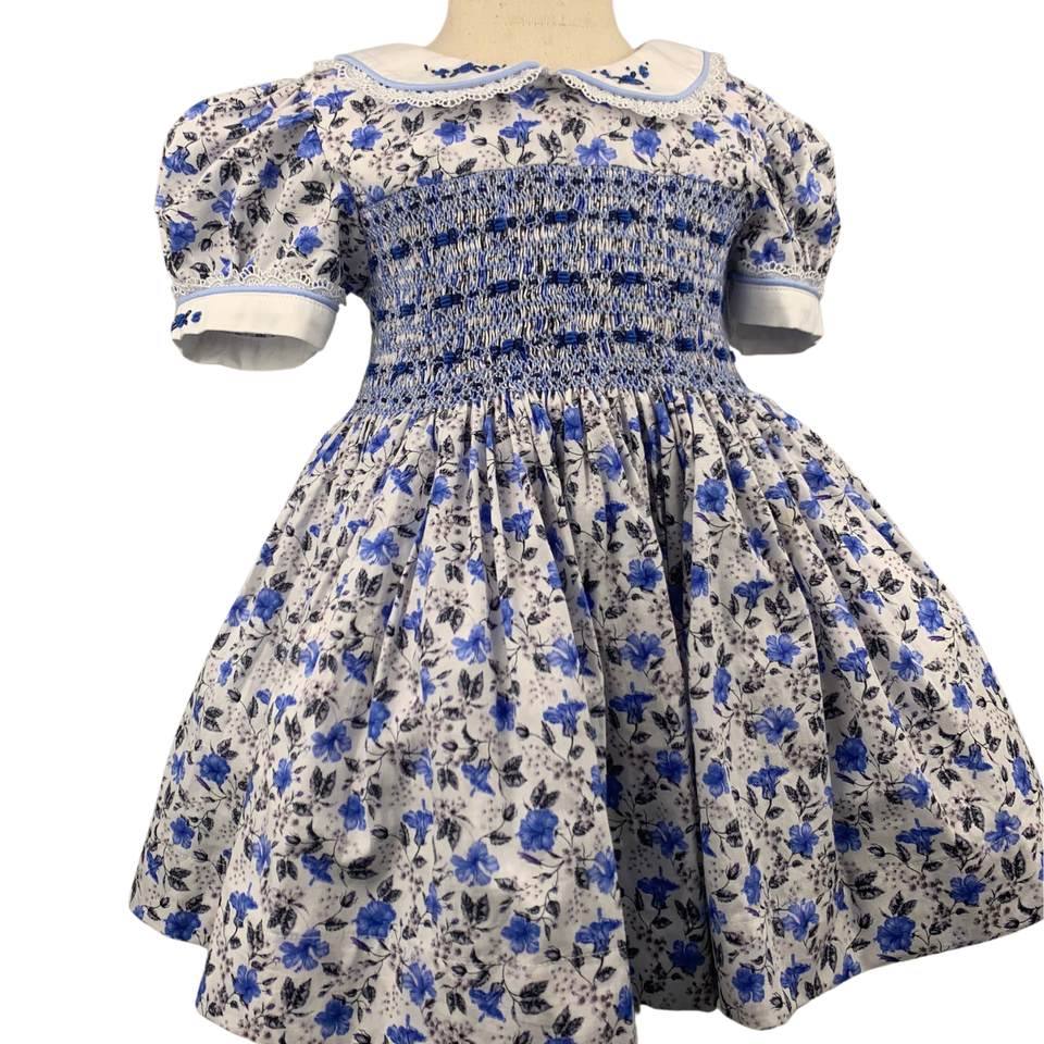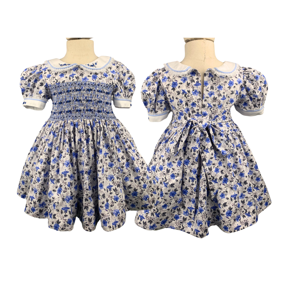 Robe de princesse personnalisée du fabricant pour bébé fille smockée 100% coton bleu avec motif floral ensemble de tissu en bambou