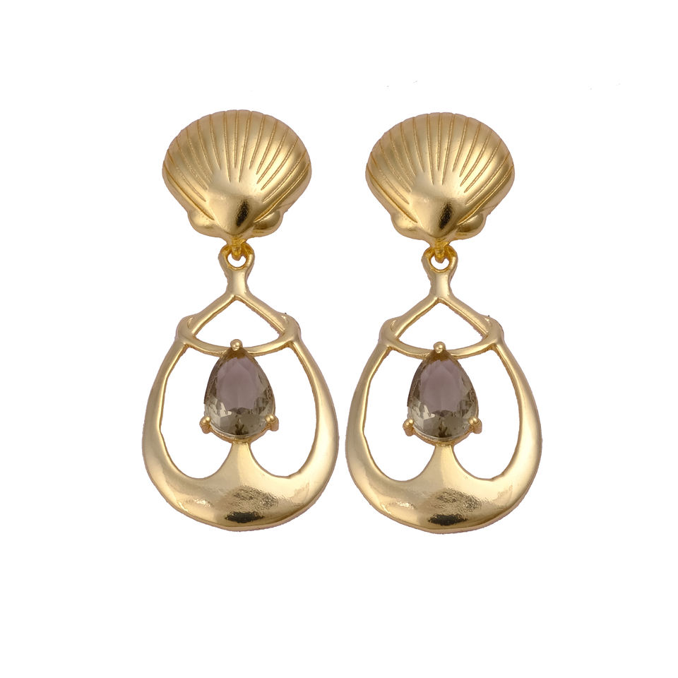 Smoky Hydro Quartz Pear Shape Shell Designer Stud Earring Gemstone Gold Plated Design Trendy Dangling Jewelry Studs