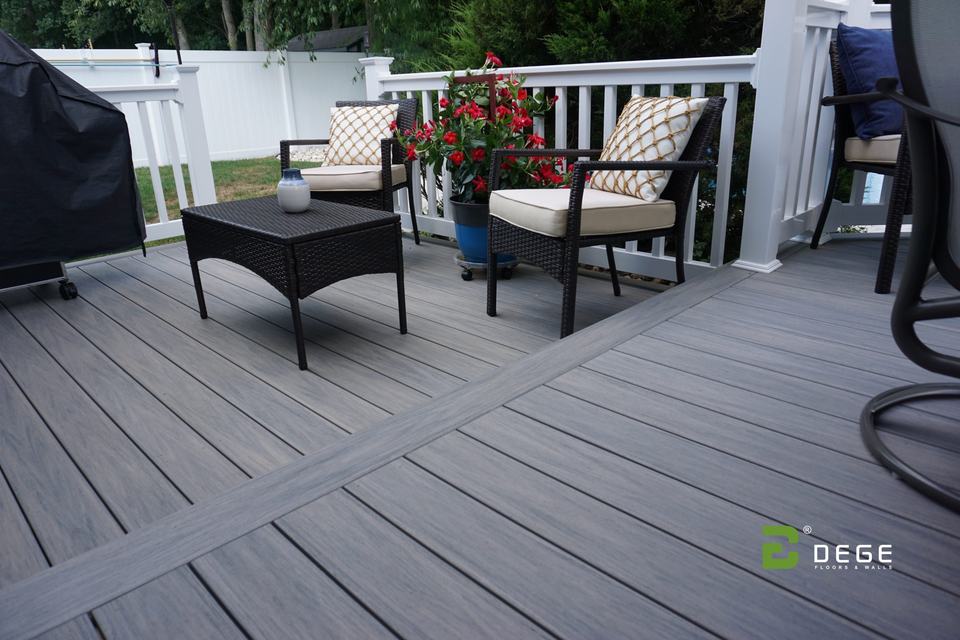 Plancher extérieur en composite bois-plastique à surface lisse, antidérapant et résistant à l'humidité, facile à nettoyer, pour terrasse d'hôtel, garantie 5 ans