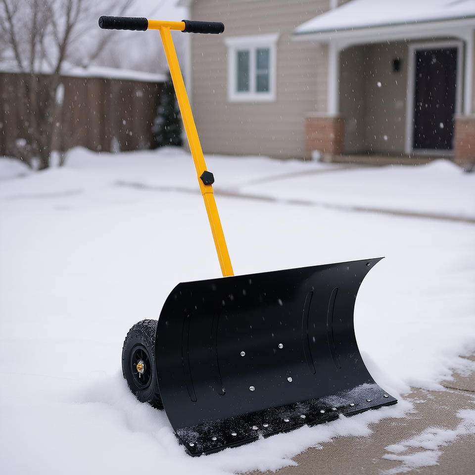 Pelle à neige avec lame de 29 pouces, roues de 10 pouces, poignée jaune à angle réglable, pousse-neige, outil de déneigement