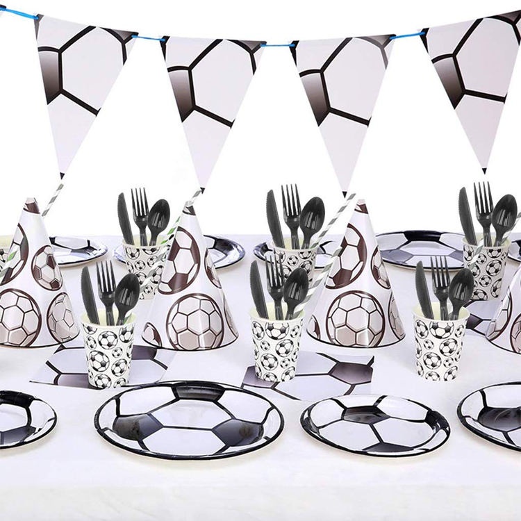 Magnifique ensemble de vaisselle jetable en papier sur le thème du football, coloré, avec centres de table de taille personnalisée pour les fournitures de fête d'anniversaire