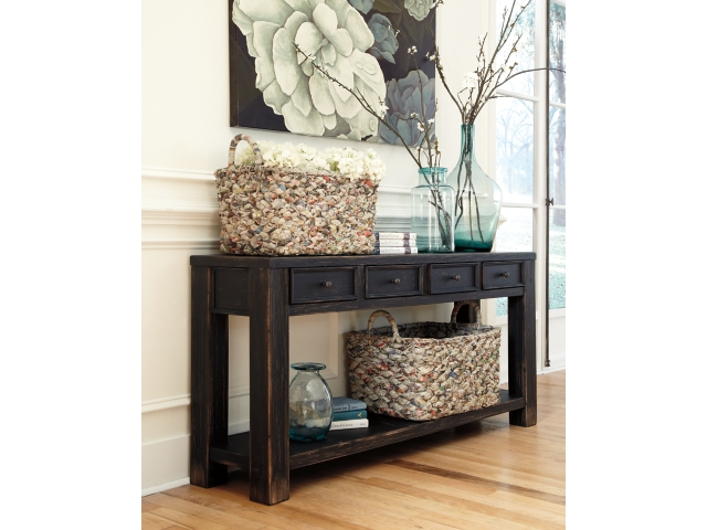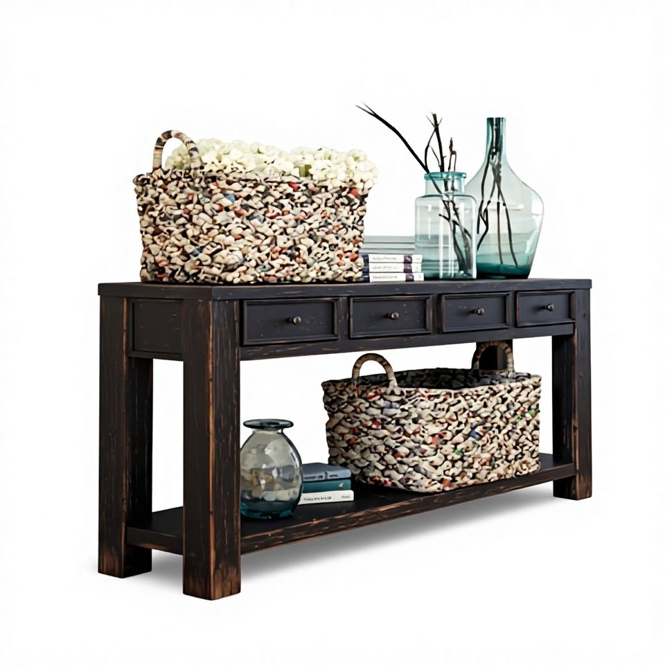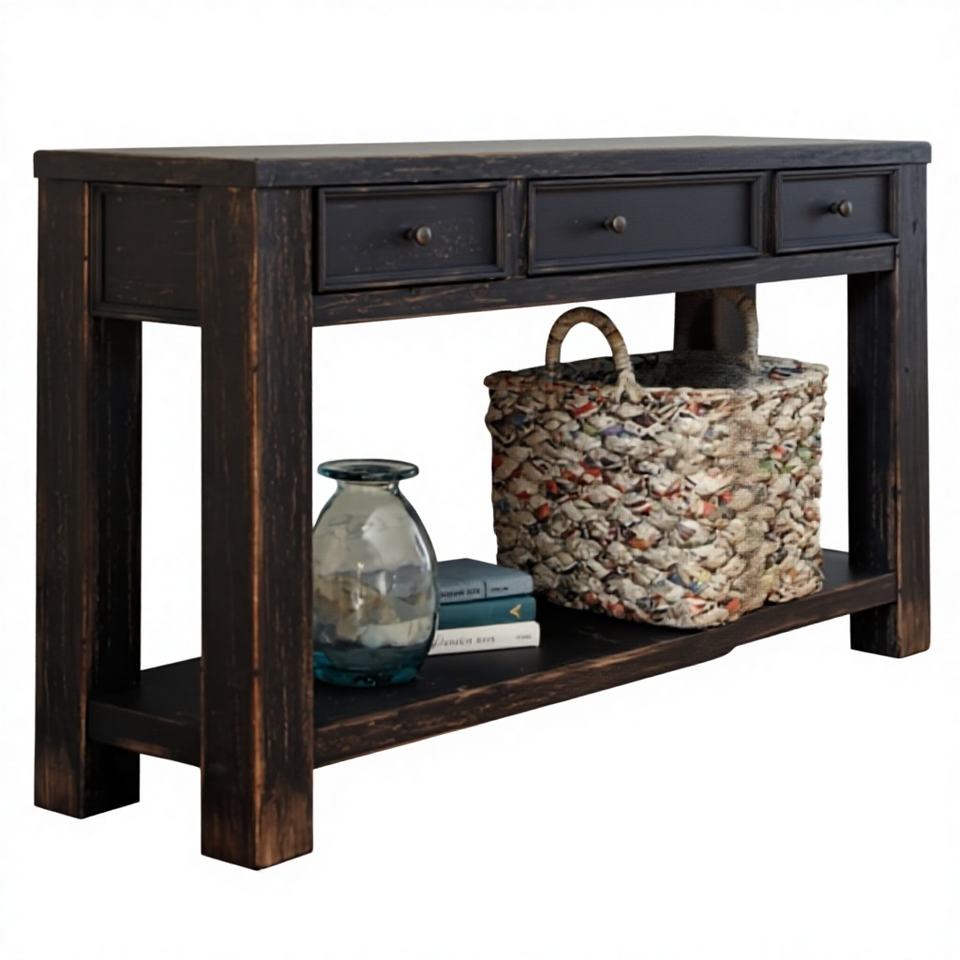 Table console de salon, panneau de style rustique vintage, finition noire vieillie, finition artisanale, pour entrée décontractée