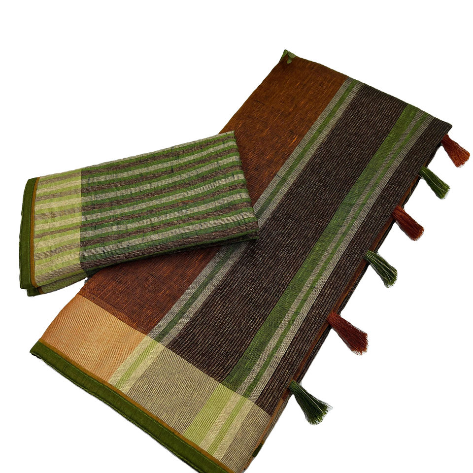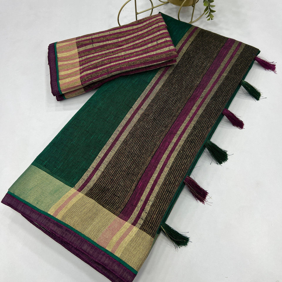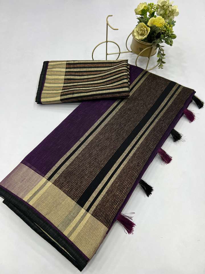 Sofisty Ladies Formal Silk Saree with Golden Border White Linen Handloom Very Indian Style
