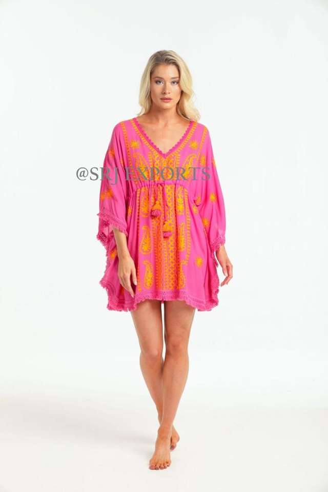 Robe caftan courte à manches chauve-souris brodée traditionnelle en tissu doux et confortable, vêtement décontracté pour femme, vêtement d'été, tunique