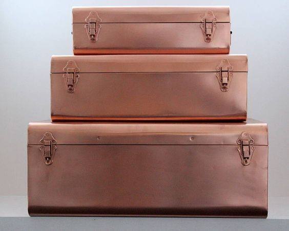 Ensemble de coffres de rangement en acier gris doux avec quincaillerie or rose pour une organisation élégante de l'espace de vie