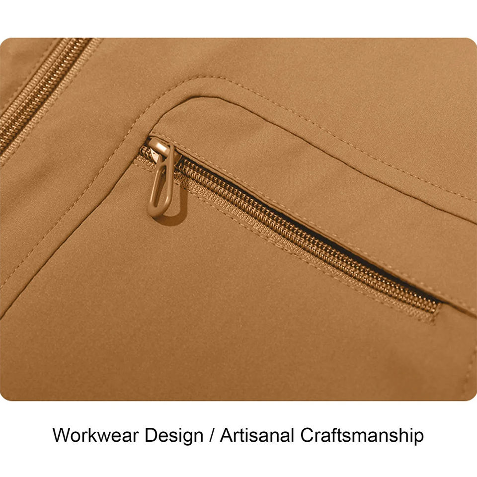 Gilet à coque souple pour hommes couleur marron col montant quatre poches zippées épaule arrondie gilet Softshell imperméable