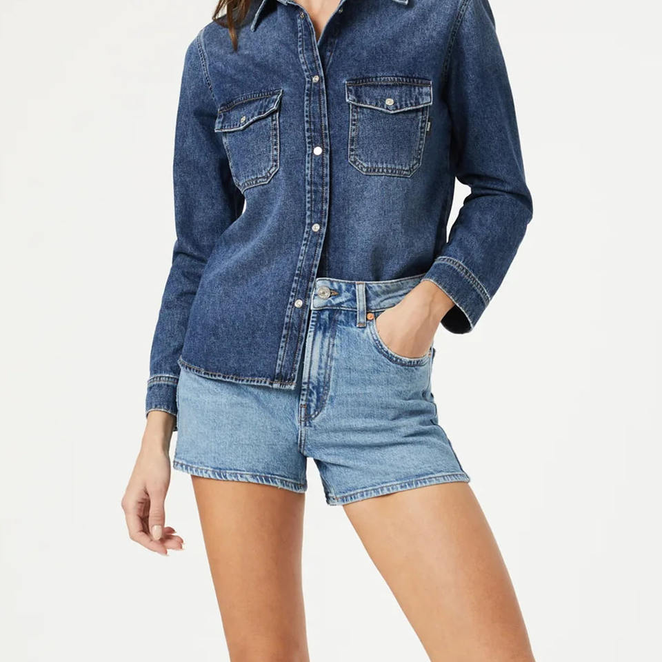 Shorts en jean délavé doux au toucher avec détails boutonnés pour femme, design moderne, écologique, respirant, coupe droite, taille mi-haute