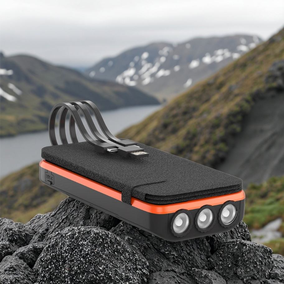 Batterie externe solaire 16000mAh avec panneau solaire, charge rapide sans fil, lampe LED et câble 3 fils