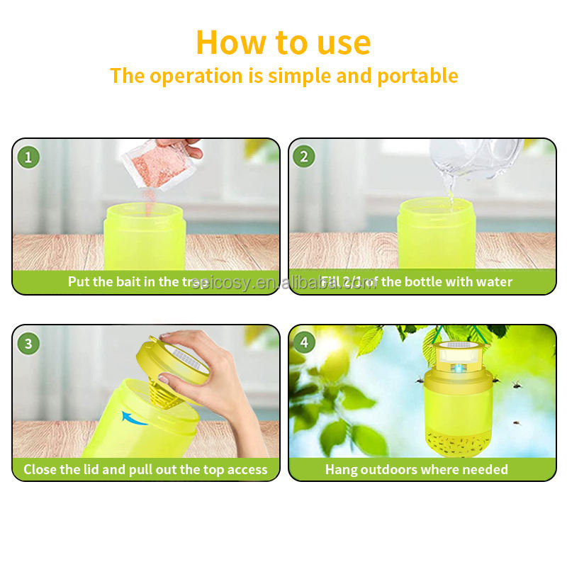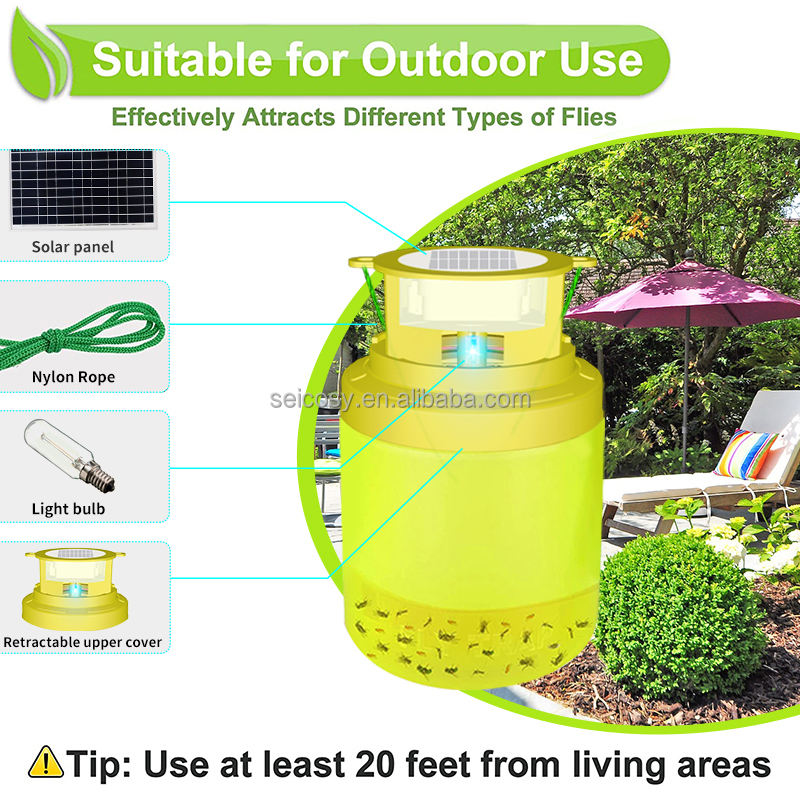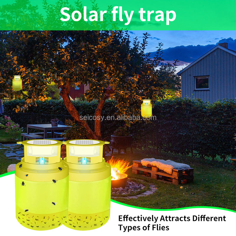 Piège à mouches solaire en plastique solide, écologique, rechargeable, pour intérieur/extérieur, attractif pour les moucherons, guêpes, mouches à fruits, couverture de 100 à 150 m²
