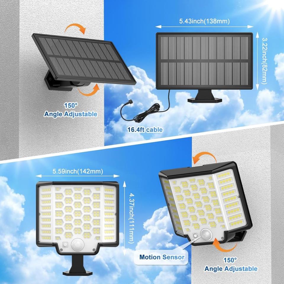 Lampe solaire extérieure étanche avec 186 LED lumineuses, détecteur de mouvement, éclairage de sécurité du crépuscule à l'aube, avec télécommande pour garage, cour, terrasse, 1 ensemble