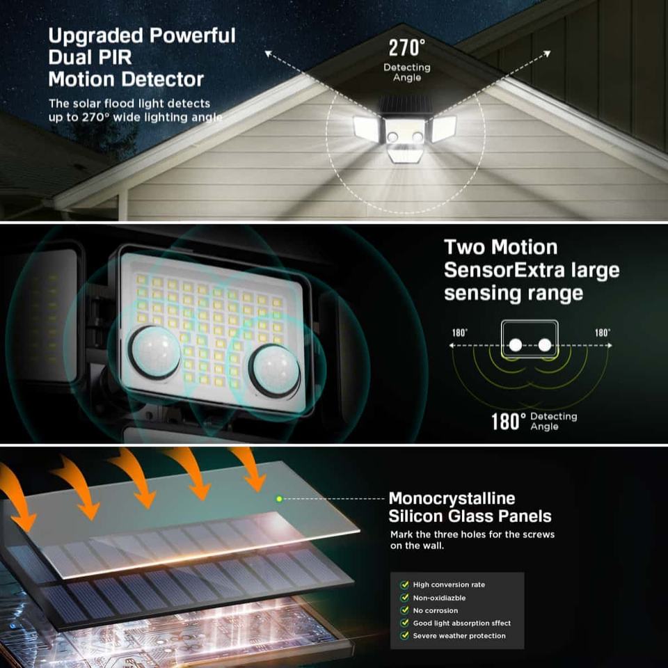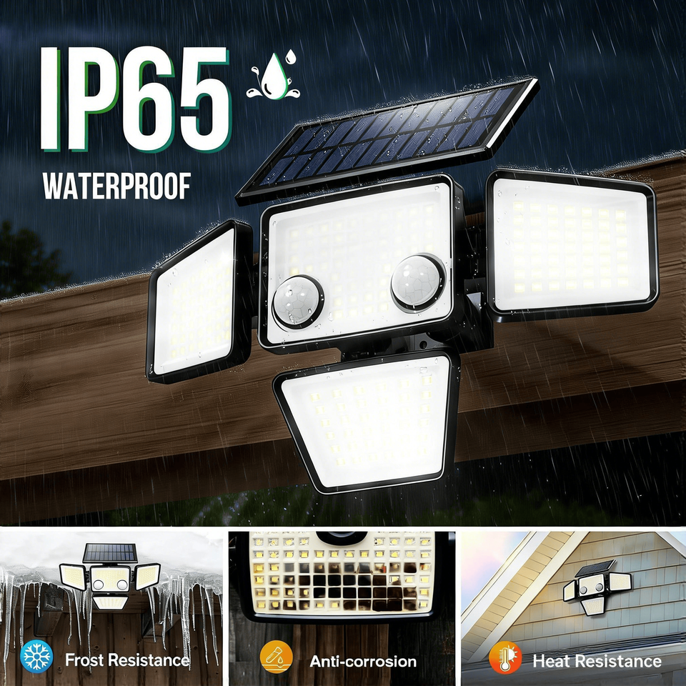 Lampe solaire extérieure à détecteur de mouvement, 4 têtes, étanche IP65, 270° ° Applique murale grand angle pour cour, patio, garage