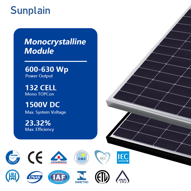 Panneau solaire 600W 610W 620W 630W 1500VDC IP68 Longue durée de vie Mono TOPCon 132 cellules Panneau solaire photovoltaïque haute efficacité pour usage domestique