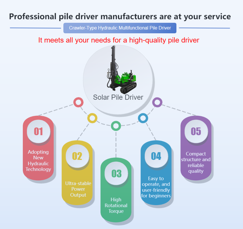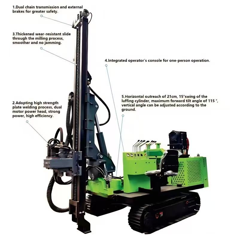 Pileuse solaire robuste sur chenilles, machine de piquage hydraulique pour sols denses et terrains rocheux en projets solaires
