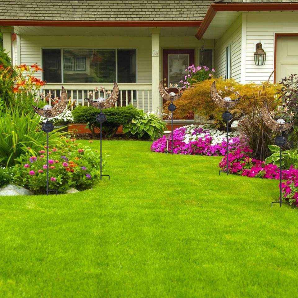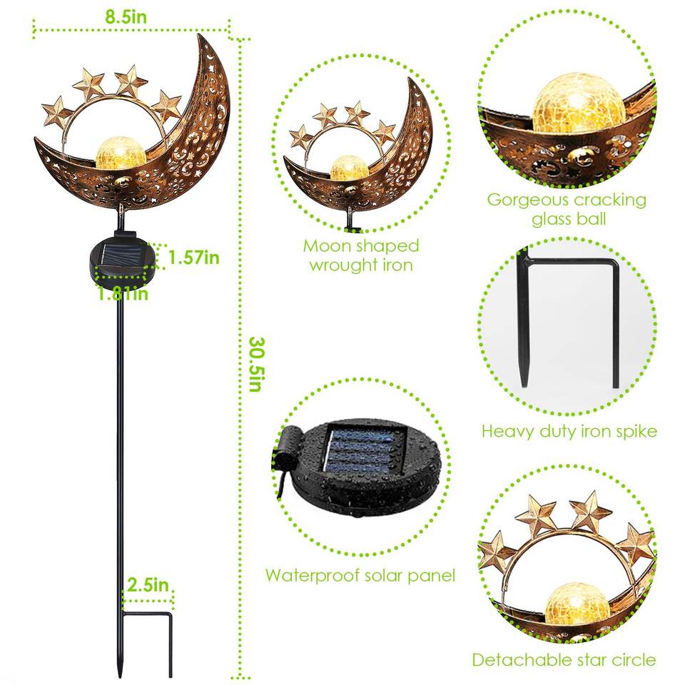 Lampes solaires IP54 étanches en forme de lune et d'étoile avec globe en verre craquelé et piquet en fer pour jardin et allée – Éclairage solaire de jardin