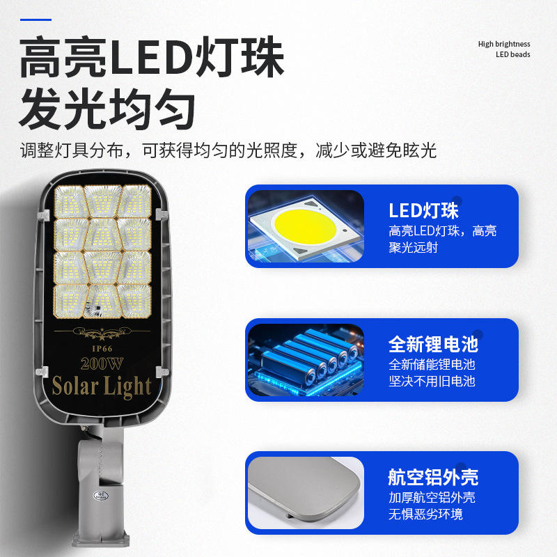 Lampadaire solaire 200W IP66 LED avec affichage de la puissance, éclairage extérieur résistant à la pluie