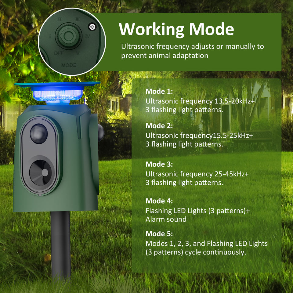 Solar Ultrasonic Animal Repeller with Triple 360 Degree Detection Flash Light IP65 Waterproof Animal Repellent for Garden Yard