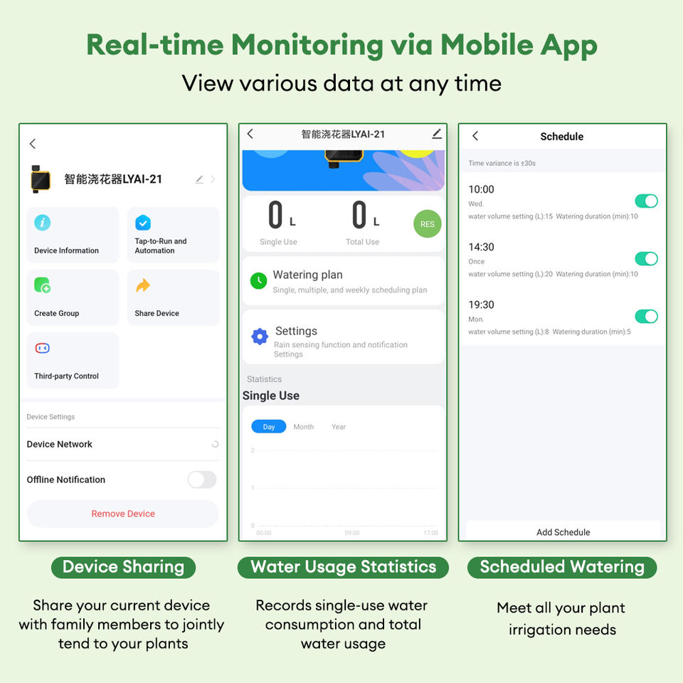Scénarios applicables:Jardin, pelouse, piscine, irrigation goutte à goutte, etc.