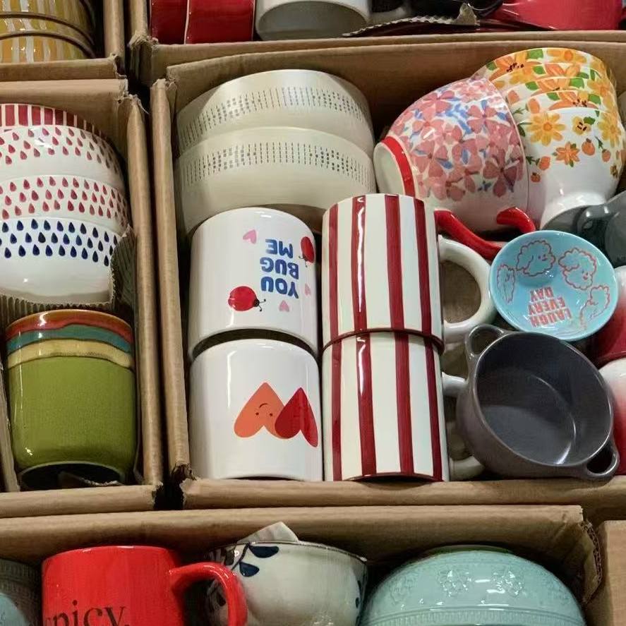 Vendu au poids en tonnes, produits en céramique colorés assortis en gros, lot de vaisselle mixte (assiettes, bols, tasses) à bas prix