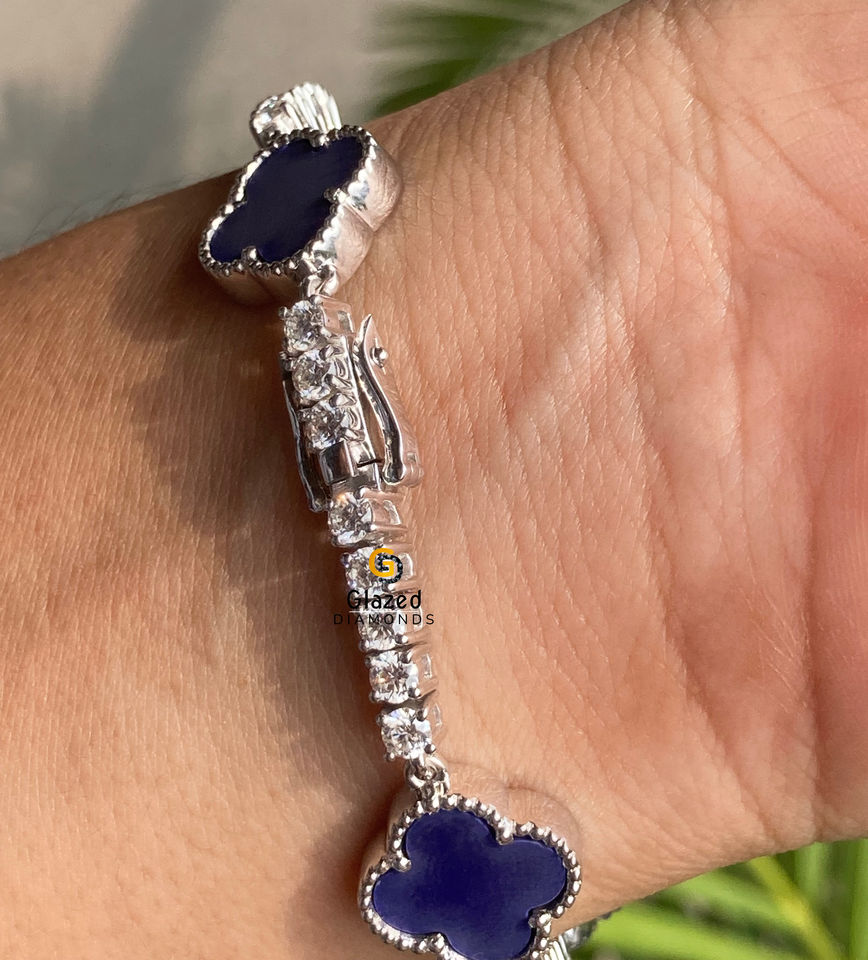 Bracelet de trèfle de tennis Hip Hop en or blanc massif 10 carats avec fleur bleue et diamants ronds de laboratoire taillés en brillant