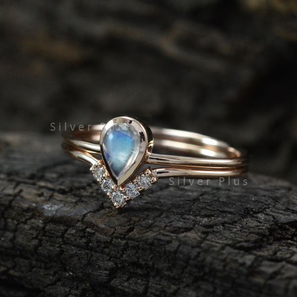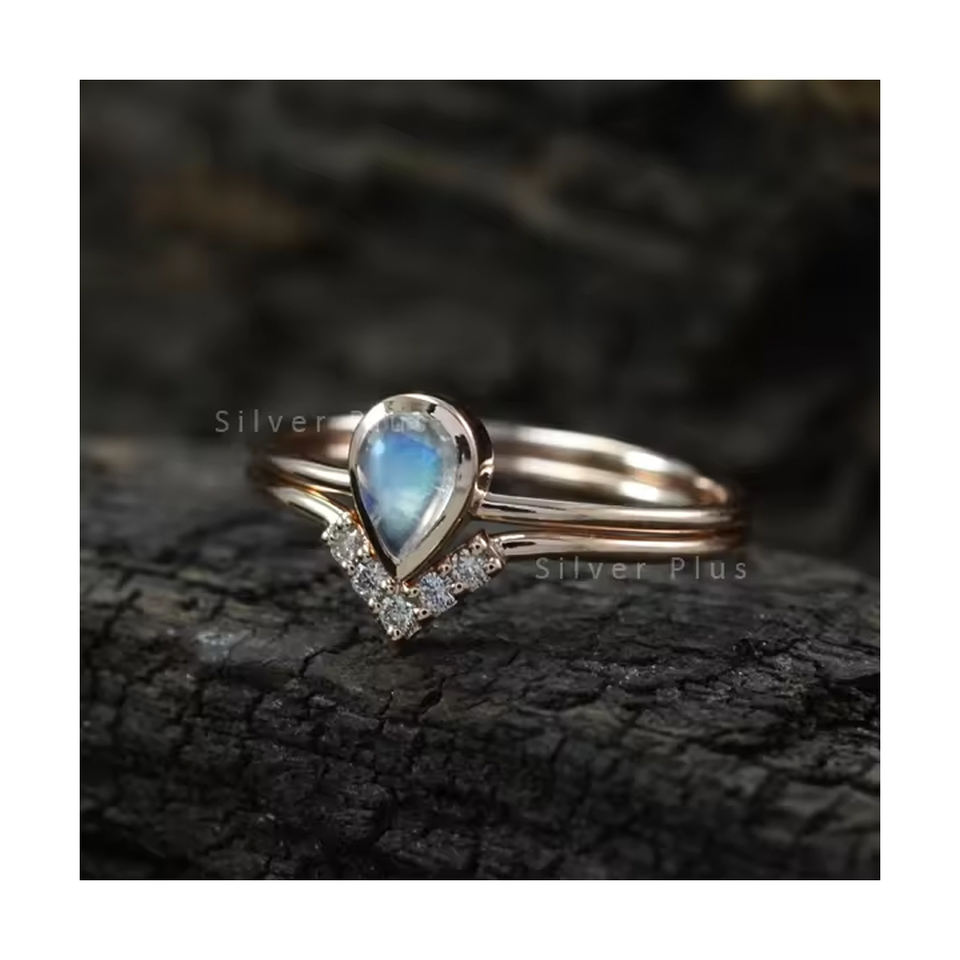 Solide 14k or jaune véritable poire forme pierre de lune bague en diamant à la main fiançailles bijoux de mariage productible en 10K/ 18K